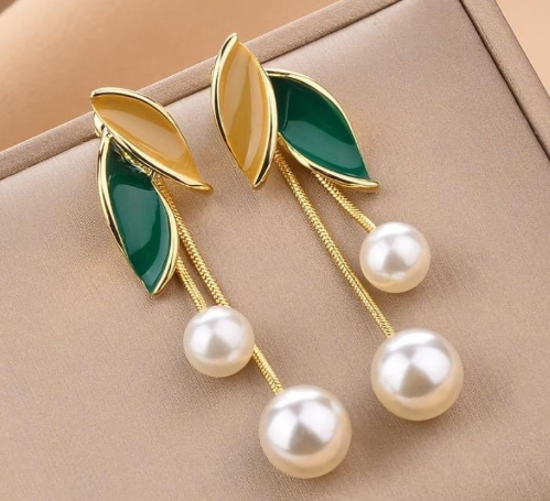 Gold Plated Earring for Women with Pearl Accent in Golden and Green quantity
